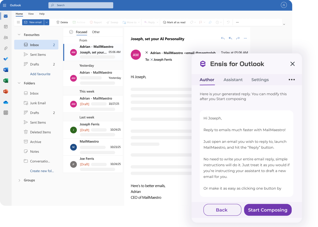 Draft, summarize, and respond to emails in seconds. Ensis integrates with Outlook to track actions, deadlines, and key communication threads effortlessly.